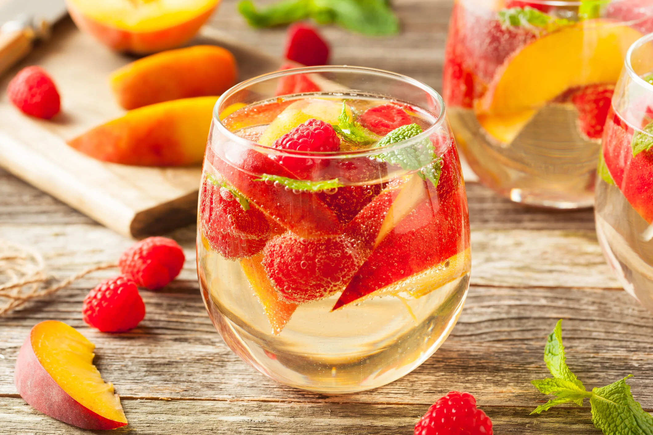 In a large pitcher, combine peaches, raspberries, mint, rosé or white wine, gran gala, and mint syrup. Stir until combined.