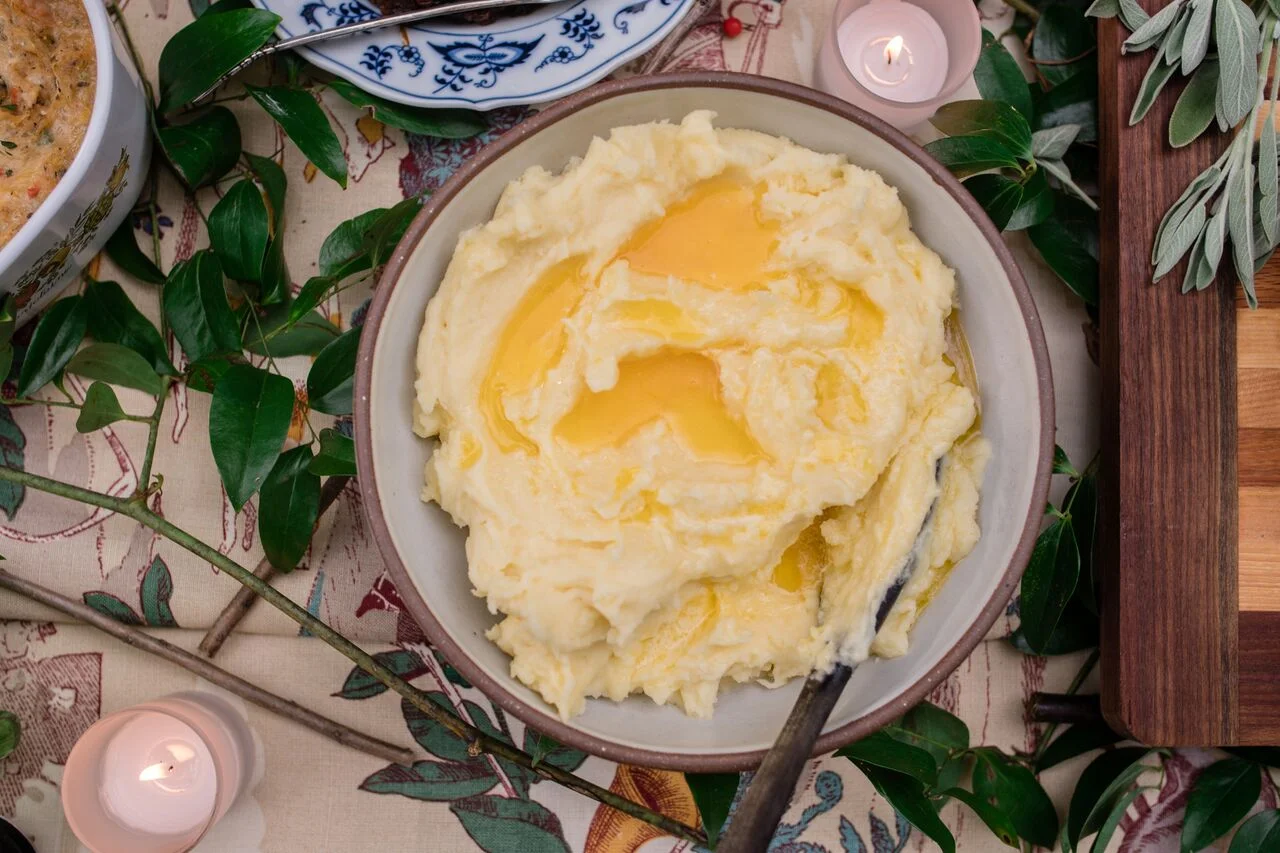 Pass hot potatoes through food mill into a large bowl (cold potatoes will become gummy), adding 1 ½ cups of the butter and cream mixture while milling the potatoes. • Once all of the potatoes have been milled, pour the remaining butter and cream mixture into potatoes, ½ cupful at a time, folding the liquid gently into the potatoes. Be careful not to overwork the potatoes. • Serve mashed potatoes topped with a few pads of Irish butter and cracked black pepper.